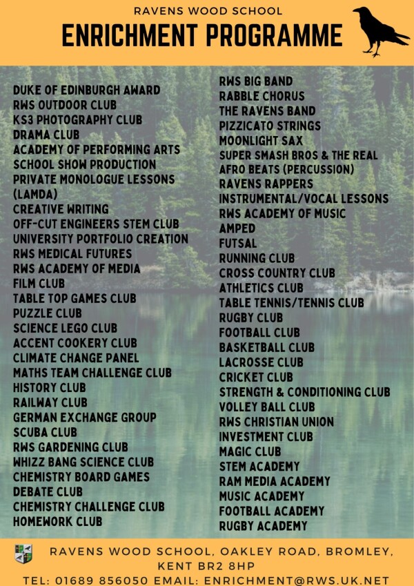 We want every student at Ravens Wood to participate in the Enrichment programme as we have seen that students who take an active role in the enrichment activities display higher levels of self-esteem, a heightened sense of belonging, increased attendance and develop positive friendship groups. This can help improve the students’ moral and social development, health and wellbeing and academic performance. You will see from the extensive range of clubs and opportunities that we have on offer that there really is something for everyone.