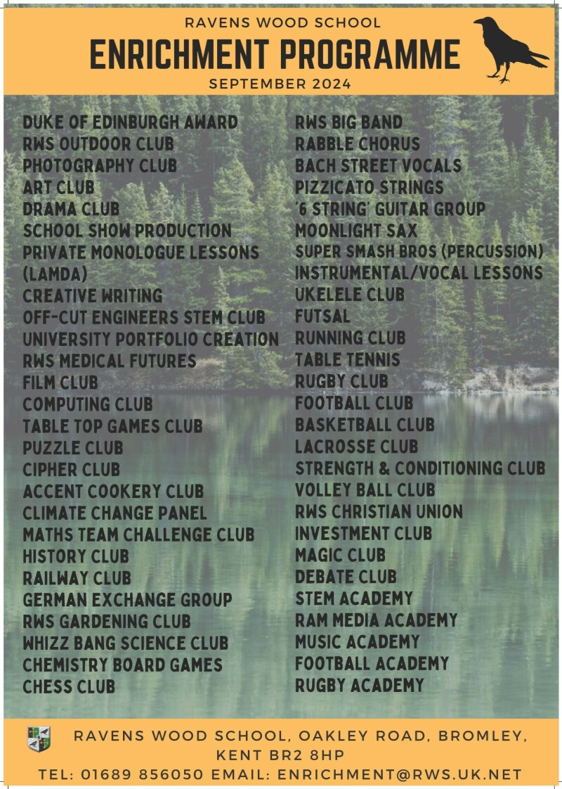 We want every student at Ravens Wood to participate in the Enrichment programme as we have seen that students who take an active role in the enrichment activities display higher levels of self-esteem, a heightened sense of belonging, increased attendance and develop positive friendship groups. This can help improve the students’ moral and social development, health and wellbeing and academic performance. You will see from the extensive range of clubs and opportunities that we have on offer that there really is something for everyone.