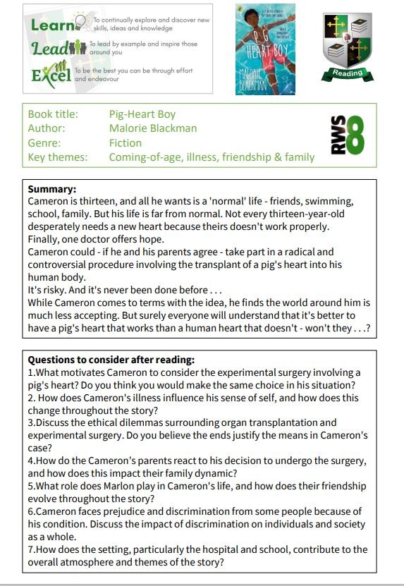 We believe in fostering a love of reading for both pleasure and purpose. Our form tutors read with students in Years 7 to 10 every week, guiding them through challenging and rewarding texts, covering a wide range of themes such as family relationships, health, war and migration, dystopian society, and perseverance in difficult situations.