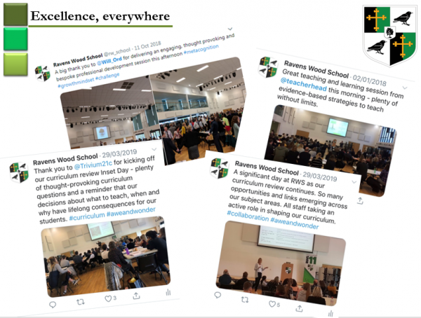 As a school, we deliver a thorough programme of CPD for our staff through weekly Breakfast Clubs and BFL Clinics, one to one coaching and mentoring, as well as Training Days which often include external key note speakers from the world of education. Recent visitors to Ravens Wood include Sue Cowley, Will Ord, Tom Sherrington, Martin Robinson, Mike Carter, Rob Neil and Phil Beadle. Our CPD programme endeavours to reflect the aims of the School Development Plan as well as the needs of the individual. New staff and those new to role receive a comprehensive induction programme. We are committed to supporting colleagues to develop through all stages of their career.